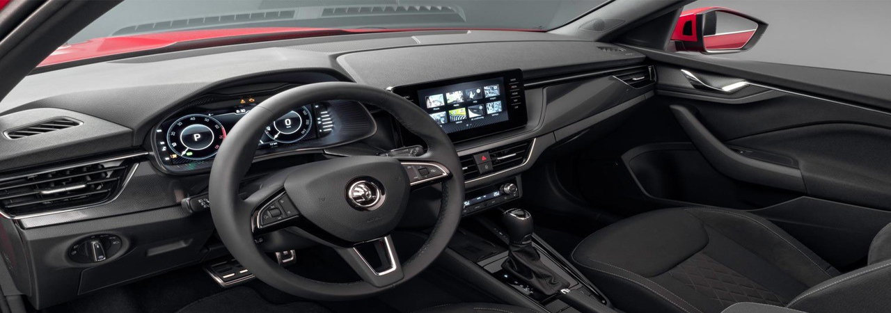 Up front, the lighting and grille sit high with slender LED headlamps skimming the leading edge of the bonnet. The rear has similarly high lighting position and the now familiar stepped boot lid has widely spaced Škoda lettering beneath the glass.
